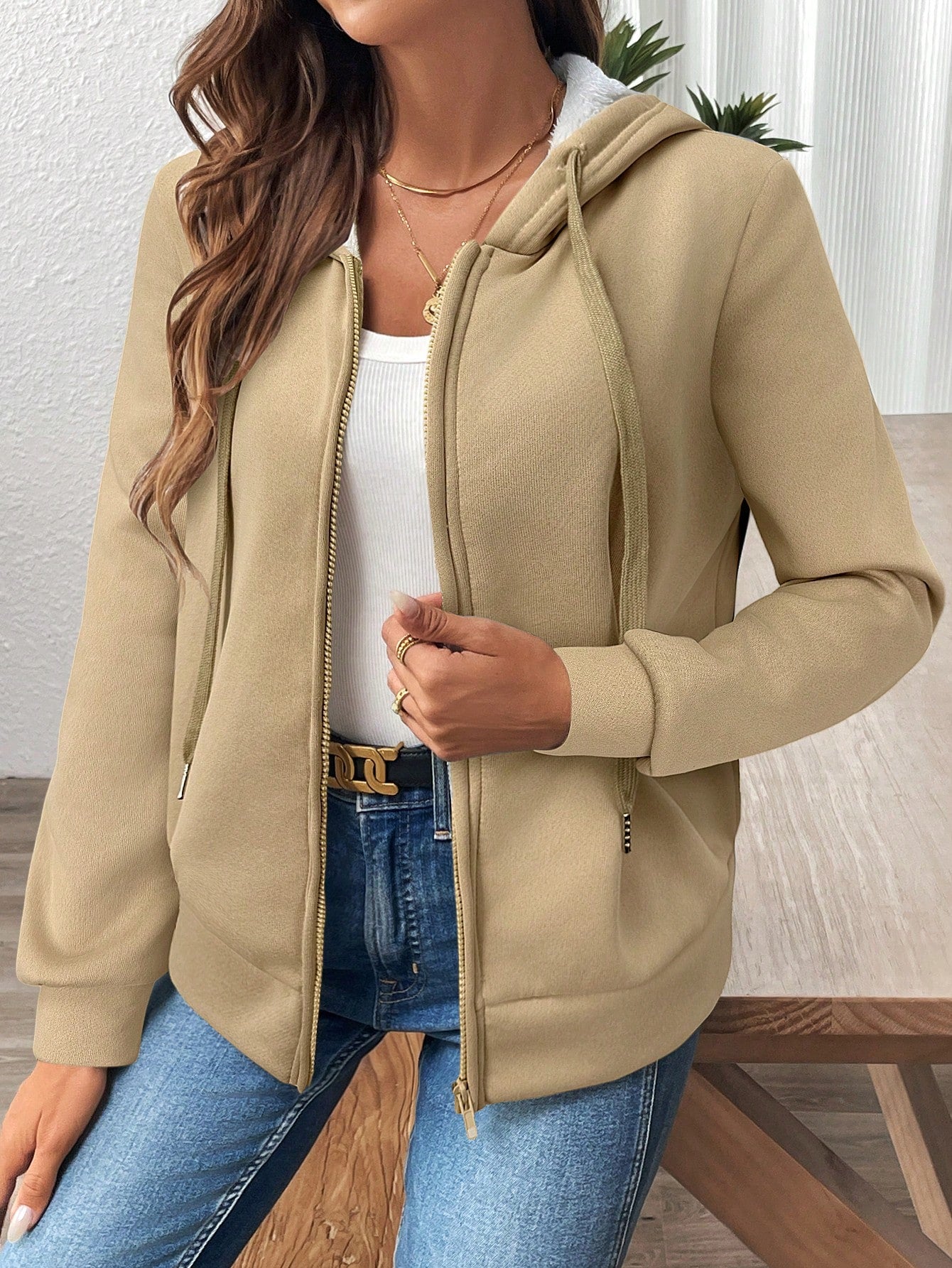 Style : CasualDetails : Drawstring, ZipperNeckline : HoodedType : Zip UpSleeve Type : Regular SleeveColor : Dark GreyPattern Type : PlainSleeve Length : Long SleeveLength : RegularFit Type : Regular FitFabric : Medium StretchMaterial : FabricComposition : 83% Polyester, 13% Viscose, 4% ElastaneCare Instructions : Machine wash or professional dry...
