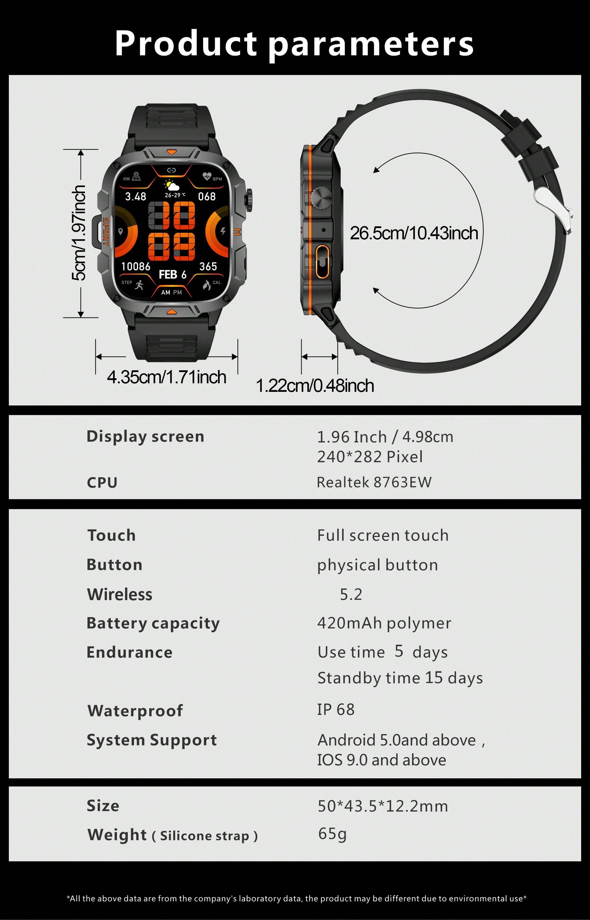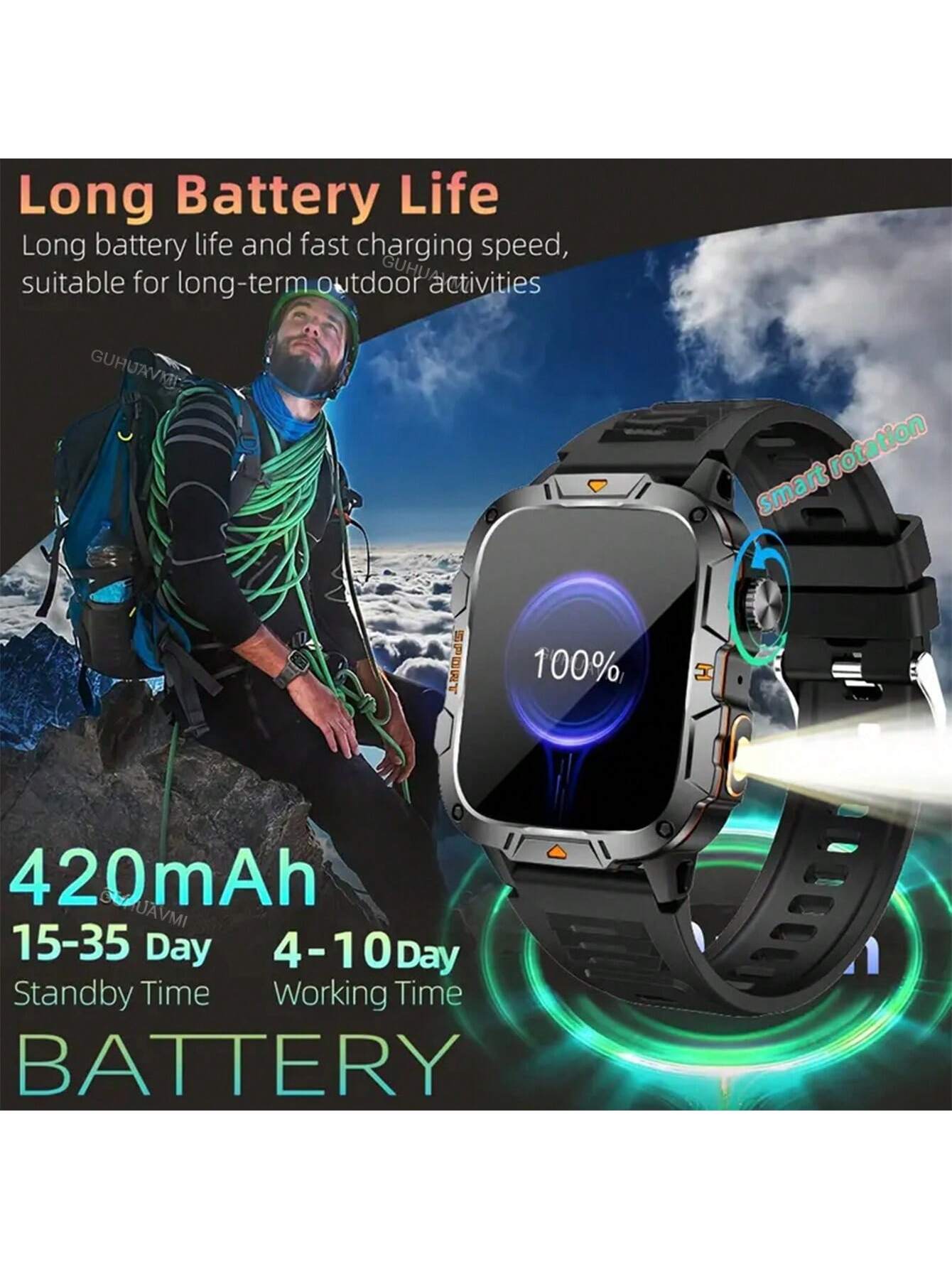 GUHUAVMI 2025 New Military Grade Outdoor Sports Smartwatch For Men, 1.96inch(4.98cm) HD Full Screen Touch, With Bluetooth Call, SOS, Push Message, Strong LED Flashlight Smart Watch, 420mAh Long Battery Life, Multi-Sports Mode