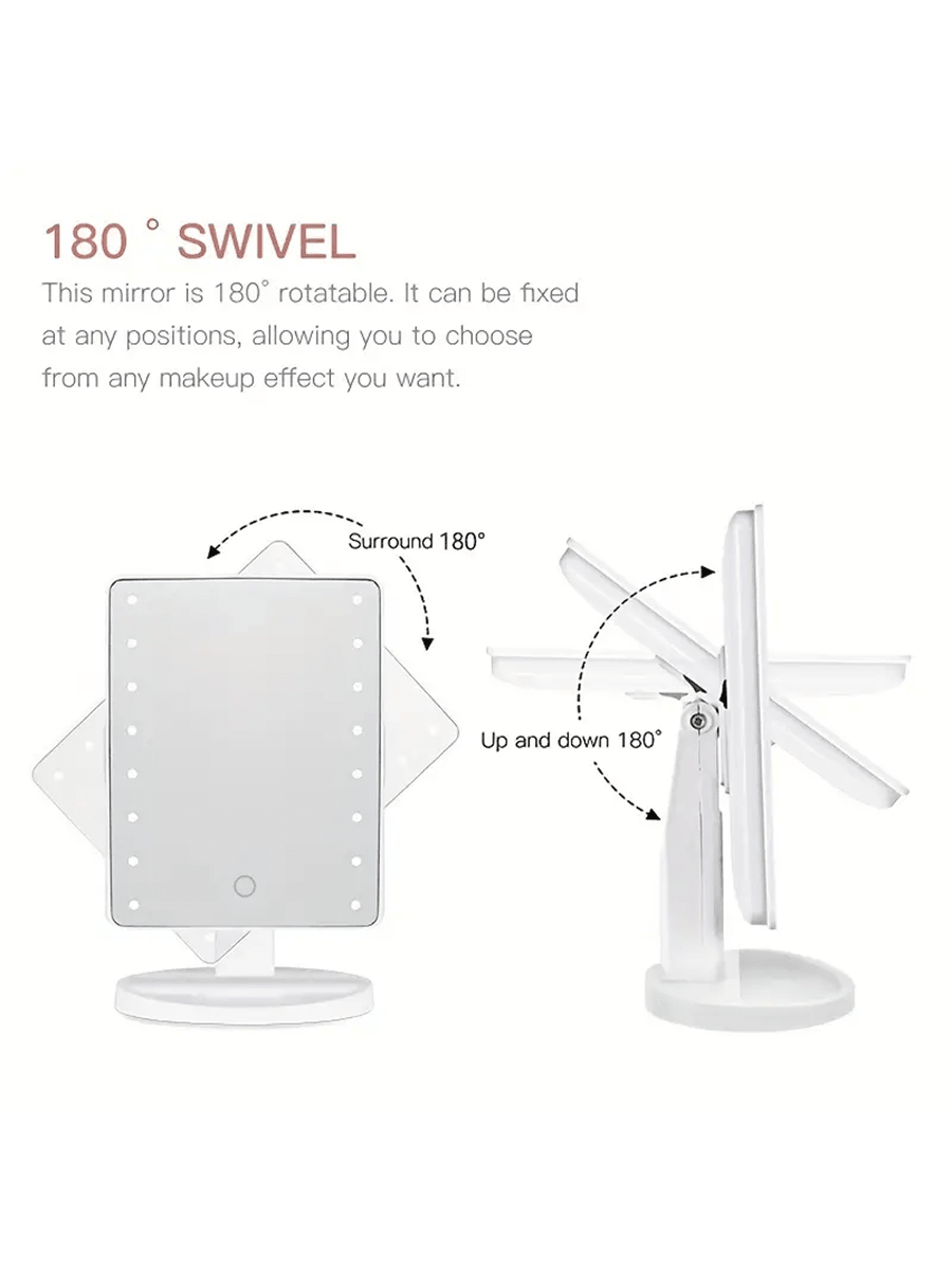 Color : WhiteType : Desktop MirrorMaterial : GlassPower Supply : USB or other DC power connection, Battery Powered(Others Battery)Batteries Included : NoBatteries Required : 4pcs AA Size Length Width one-size 10.8 6.9