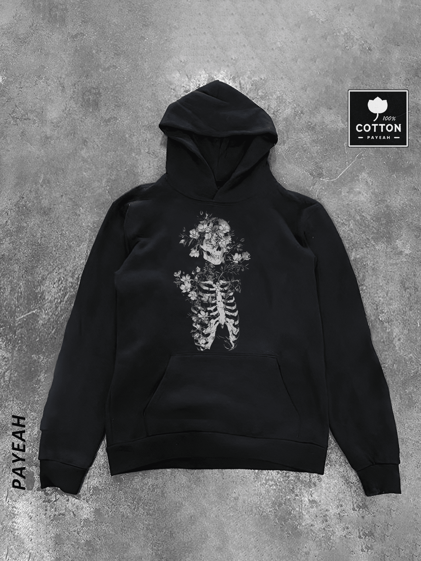 Sleeve Type : Drop ShoulderColor : BlackDetails : Drawstring, PocketNeckline : HoodedStyle : CasualPattern Type : Floral, Halloween, PlantsSleeve Length : Long SleeveLength : Regular Size Bust Length S 40.2 27.2 M 44.1 28 L 48 29.1 XL 52 29.9 XXL 55.9 31.1 XXXL 59.8 31.9