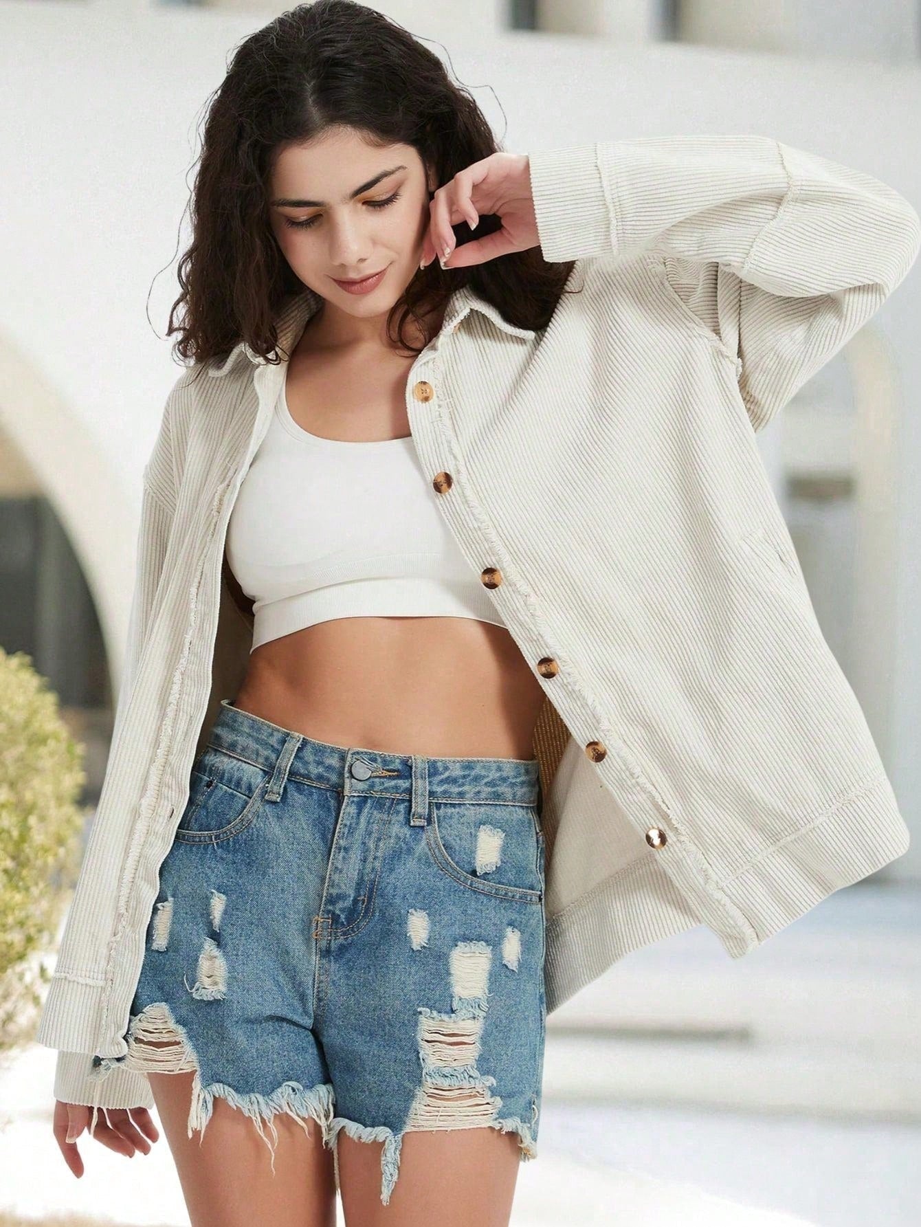 Corduroy Jacket Women Distressed Shacket Jacket Long Sleeve Raw Trim Oversized Cord Top