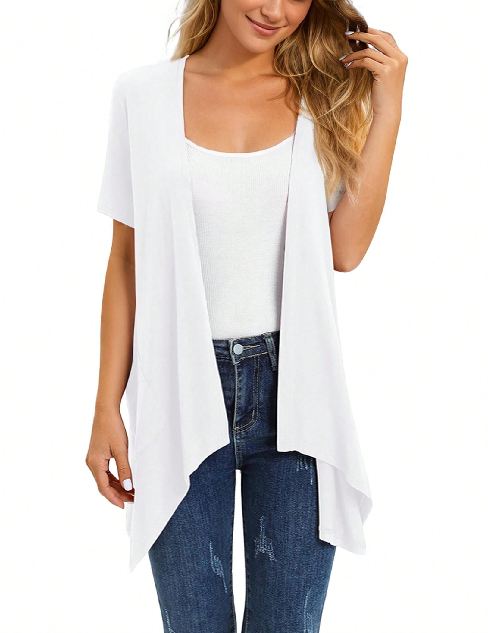 Details : AsymmetricalHem Shaped : AsymmetricalStyle : CasualSleeve Type : Regular SleeveFeatures : Wind-ProofNeckline : Cardigan CollarColor : WhitePattern Type : PlainSleeve Length : Short SleeveFit Type : Regular FitLength : RegularMaterial : Knitted FabricComposition : 93% Polyester, 7% ElastaneCare Instructions : Machine wash, do not dry cleanSheer : NoFabric...