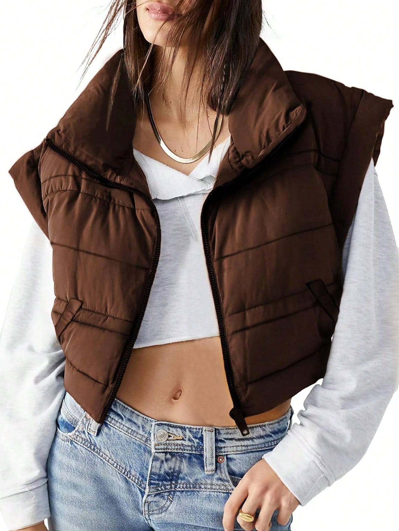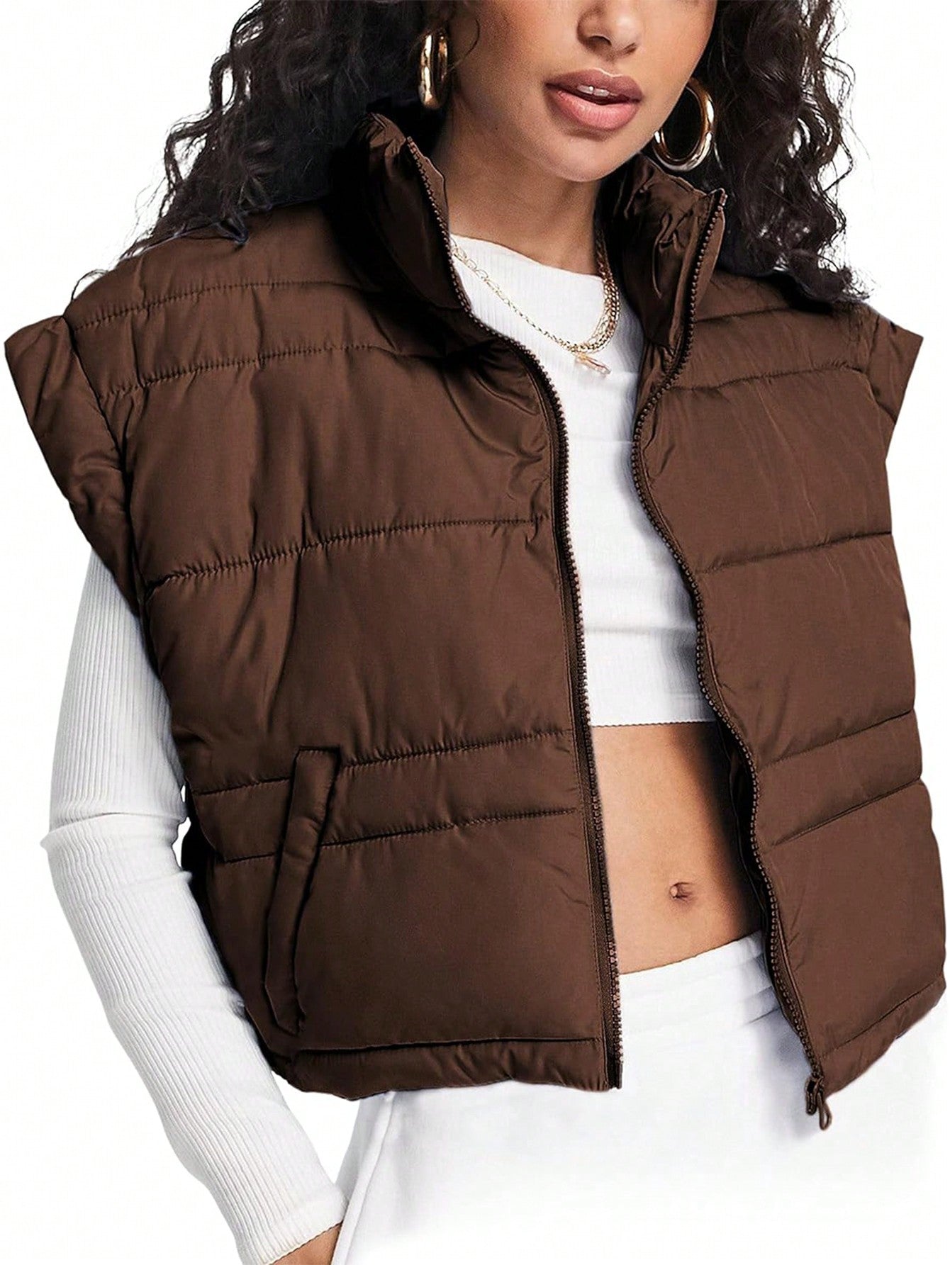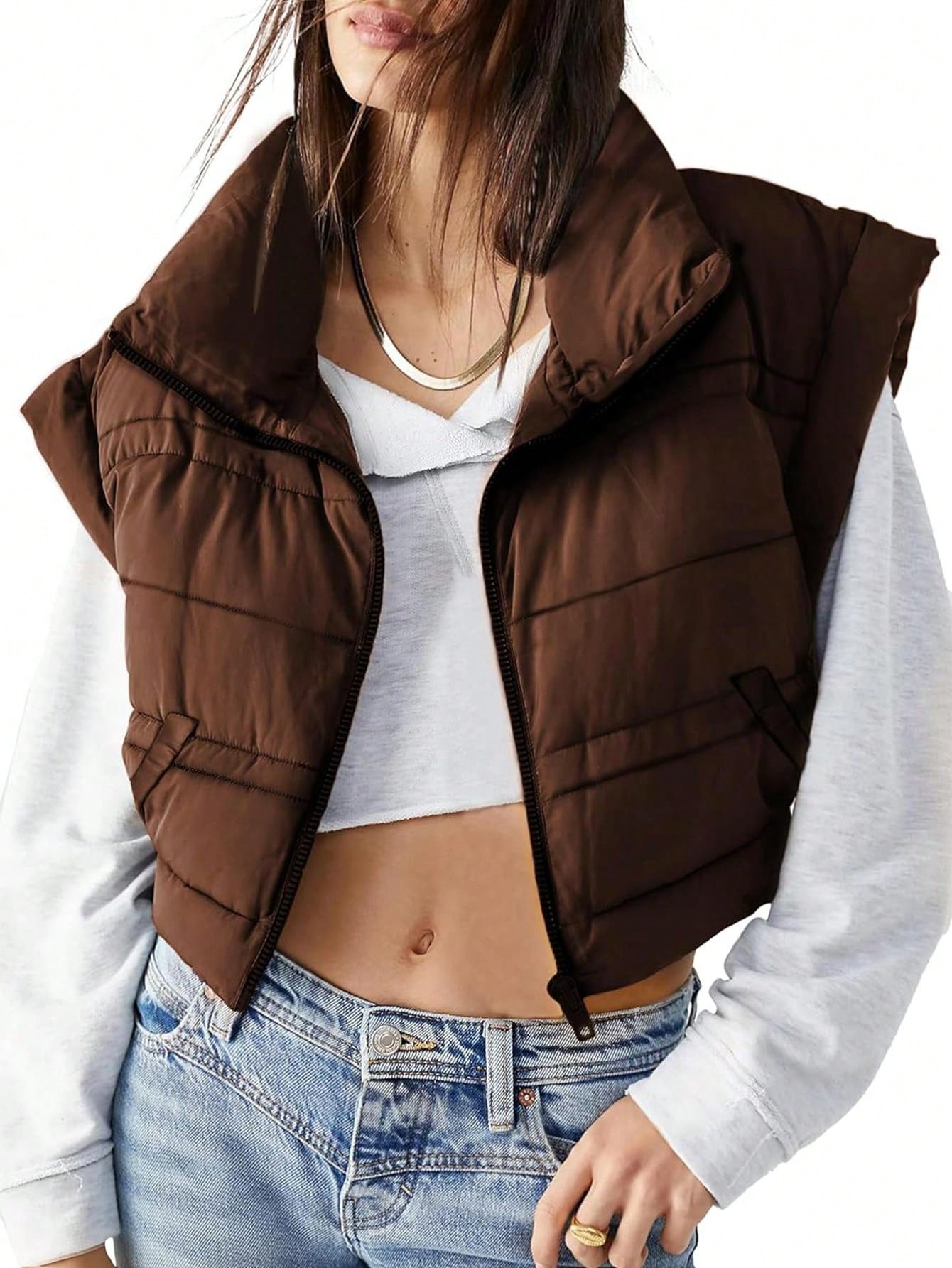 Details : Zipper, PocketStyle : CasualPlacket : ZipperType : vestNeckline : Funnel NeckColor : BrownPattern Type : PlainLength : CropFit Type : LooseFabric : Non-StretchCoating : 100% PolyesterMaterial : Composite FabricPockets : NoSheer : NoLining : 100% Polyester Size Shoulder Length Bust Hip Size S 23.6 19.7 42.5 42.5 M...