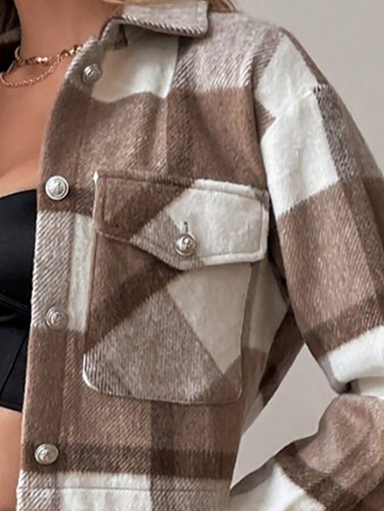 Style : Party, Elegant, CasualFeatures : Comfortable, BreathableDetails : PocketType : ShacketNeckline : CollarPlacket : Single BreastedSleeve Type : Regular SleeveColor : KhakiPattern Type : PlaidSleeve Length : Long SleeveLength : ShortFit Type : Regular FitFabric : Slight StretchMaterial : Wool-Like Fabric Size Shoulder Length Sleeve Length Bust S 20.1...