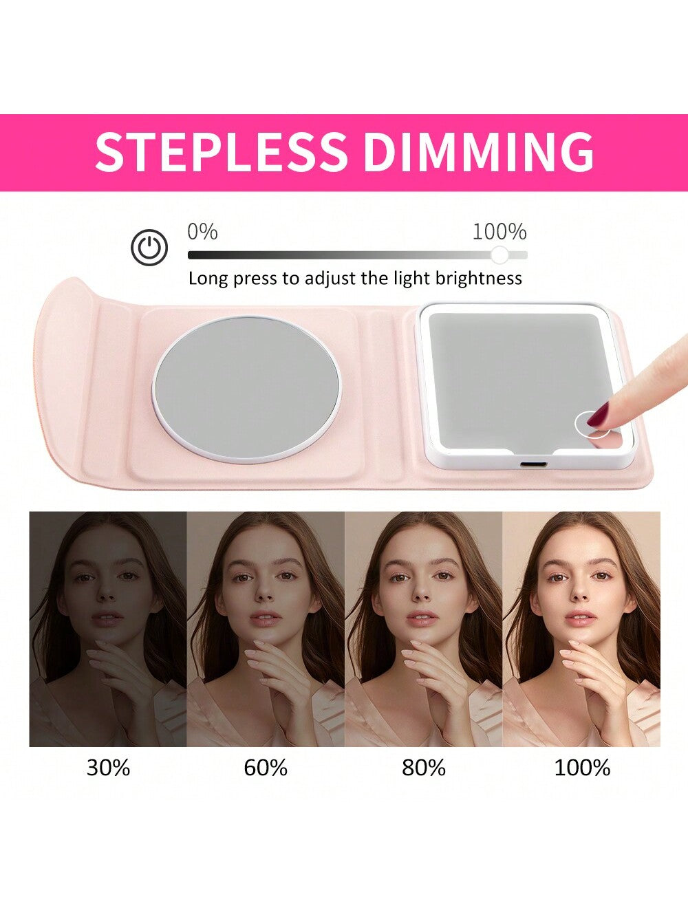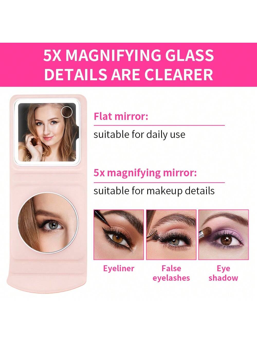 Color : PinkType : Portable Mirror, Pocket Mirror, LED Makeup MirrorMaterial : PU LeatherPower Supply : USB or other DC power connectionBatteries Included : YesShapepattern : Square